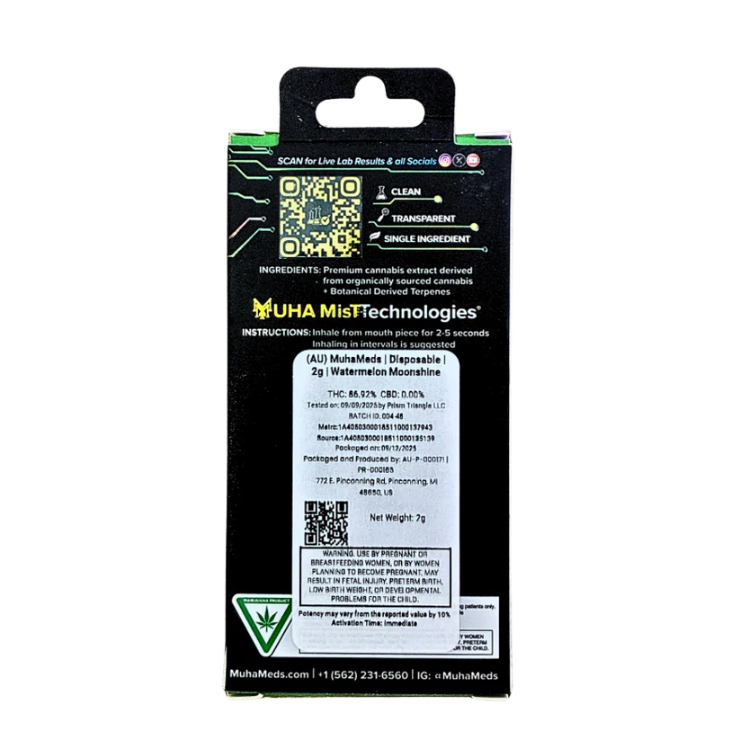 The 2-gram disposable device is engineered to deliver reliable, long-lasting performance. MUHA MEDS equips each unit with a powerful internal battery designed to outlast the entirety of the oil chamber, ensuring every drop is enjoyed to its fullest. A clog-resistant airflow system and optimized coil technology guarantee smooth, consistent hits throughout the device’s lifespan. Compact, discreet, and easy to carry, Watermelon Moonshine is perfect for on-the-go convenience without compromising quality or flavor.